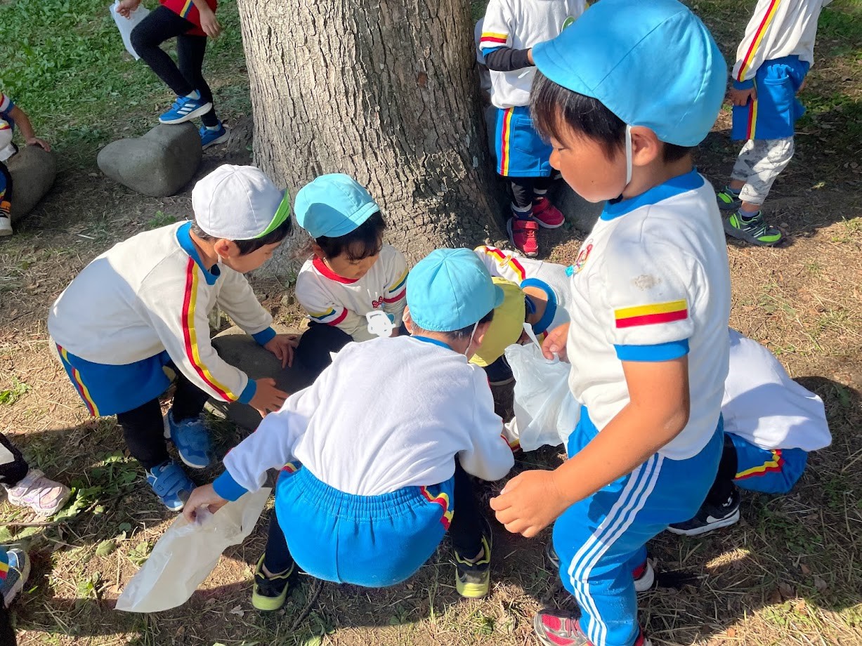全園児で歩いて称名寺へ遠足に出掛けました。広場では虫探しや、落葉拾い、おいかけっこ等をしてそれぞれ楽しい時間を過ごしました。ダンゴムシを見つけるために、大きな石を何とかひっくり返そうと格闘中の子どもたちです。