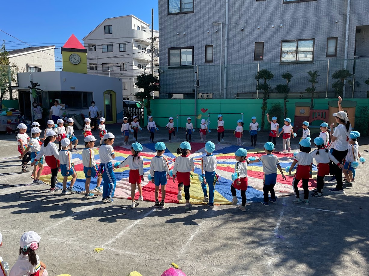 11月11日(土)の運動会に向けて、頑張っている子どもたちです!お友達と心を一つにして取り組むパラバルーン!最後には真ん中からミラーボールが飛び出します!