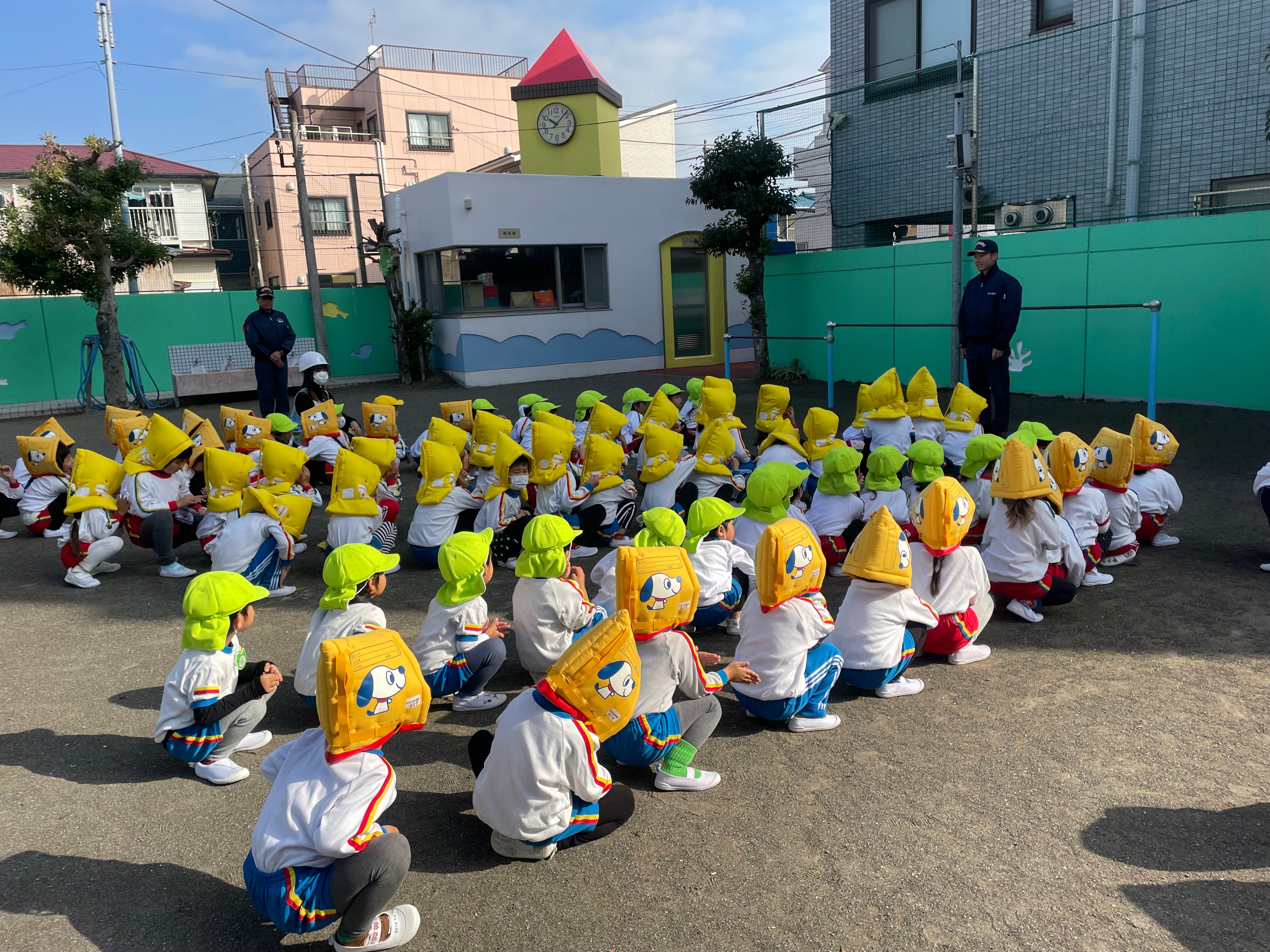 火災による避難訓練の後、消防署の方の訓練指導を受けました。いつもとは違う様子に少し緊張している様子が見られましたが、「おしゃべりしないで上手でしたね」と言われ、ニコッと笑顔になった子どもたちでした。