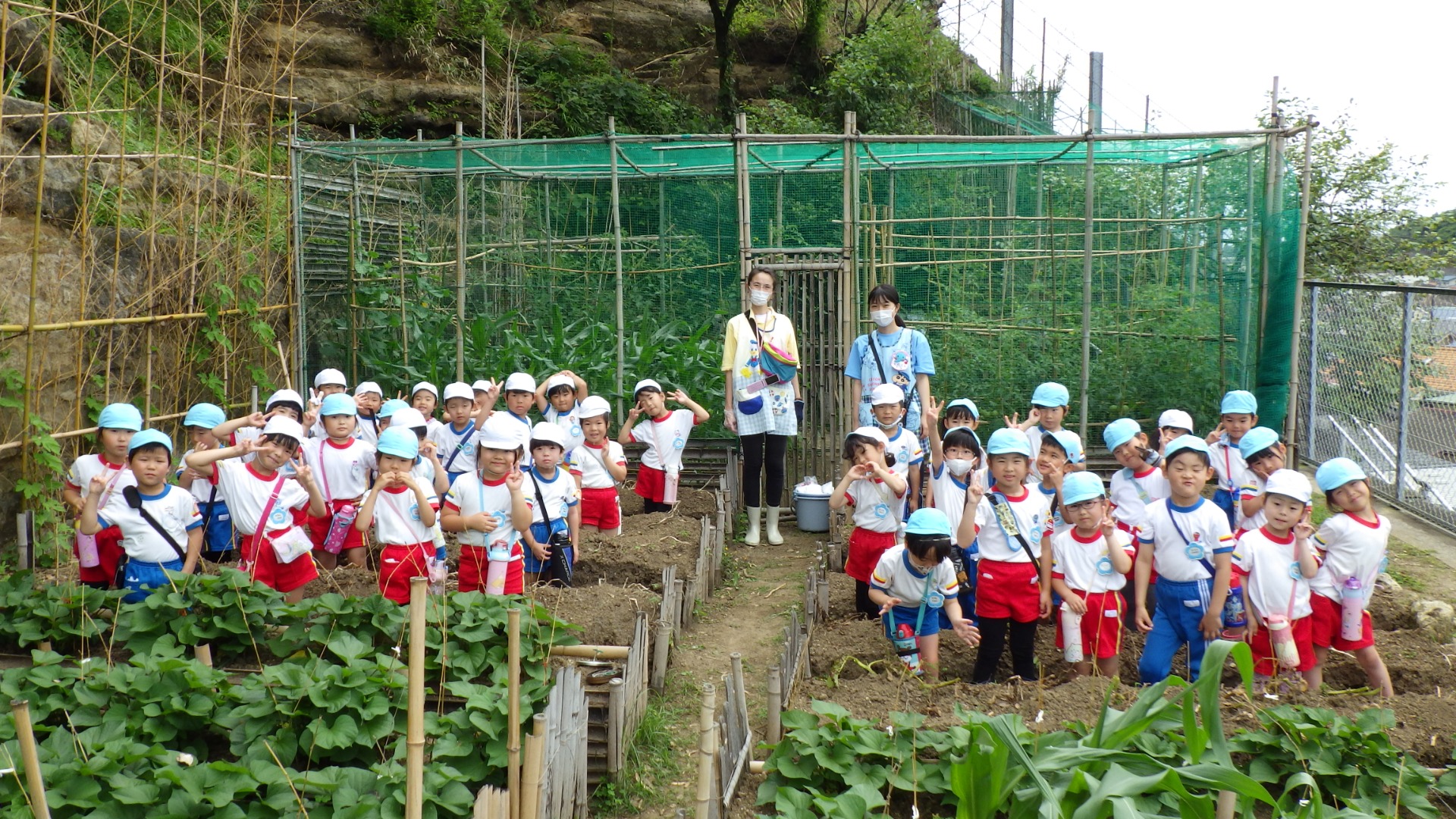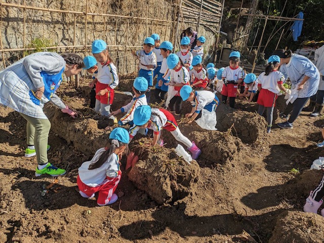 年長さんが園長先生の畑へさつまいも掘りに出掛けました。たくさん掘れるかな。