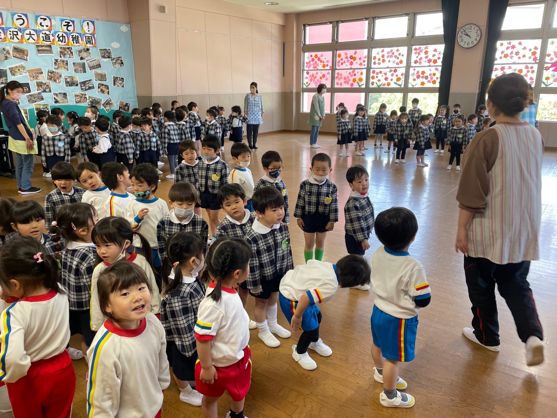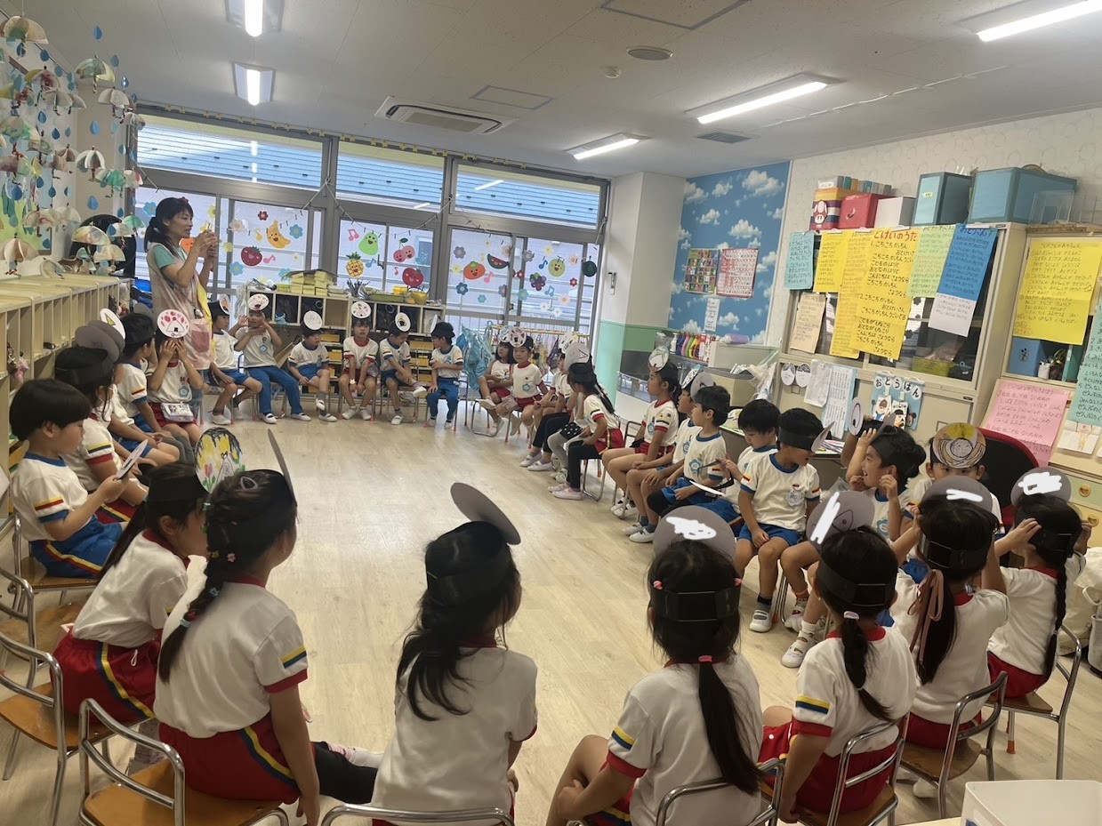 全園児が集まって、新入園児を迎えるwelcome partyをしました。緊張気味で参加した新入園児に、年長さんから♬さんぽの歌のプレゼント!知っている歌を聞いて、子どもたちの緊張も少しほぐれたようです。そのあとは、みんなでお菓子を食べました。お菓子を食べると、みんなニッコニコ😊これから仲良く楽しく過ごしましょうね!