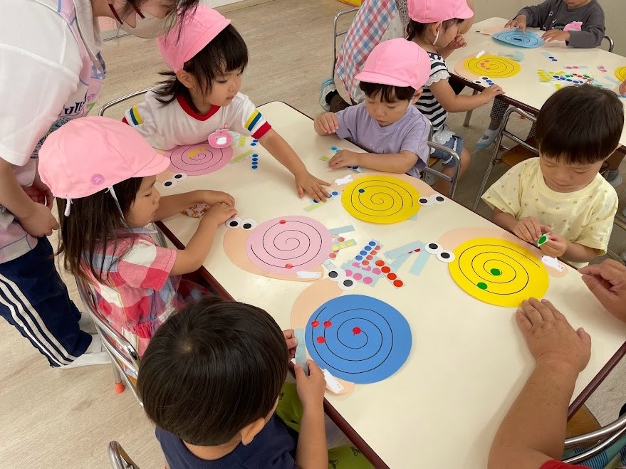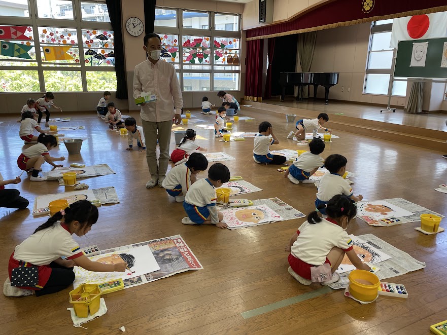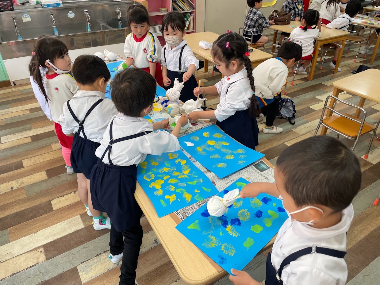 お父さんこいのぼりと、お母さんこいのぼりの模様は各クラス、オリジナルで作ります。お父さんこいのぼりの台紙にたんぽを使って、模様付け。ポンポンと押す感覚が楽しかったようで、みんな夢中になって作っていましたね。