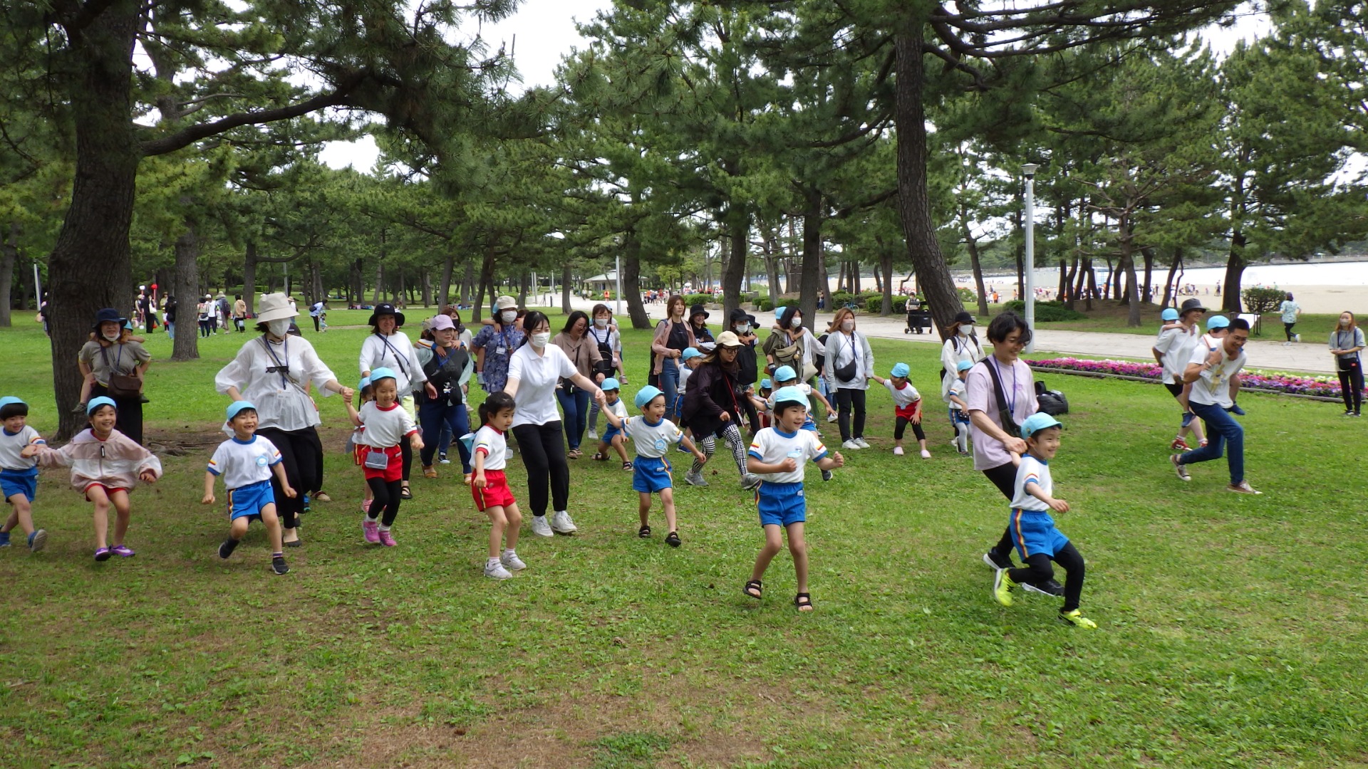 海の公園へ、親子で遠足に出掛けました。親子一緒に「だるまさんがころんだ」をして、大盛り上がりの年長さん(≧▽≦)