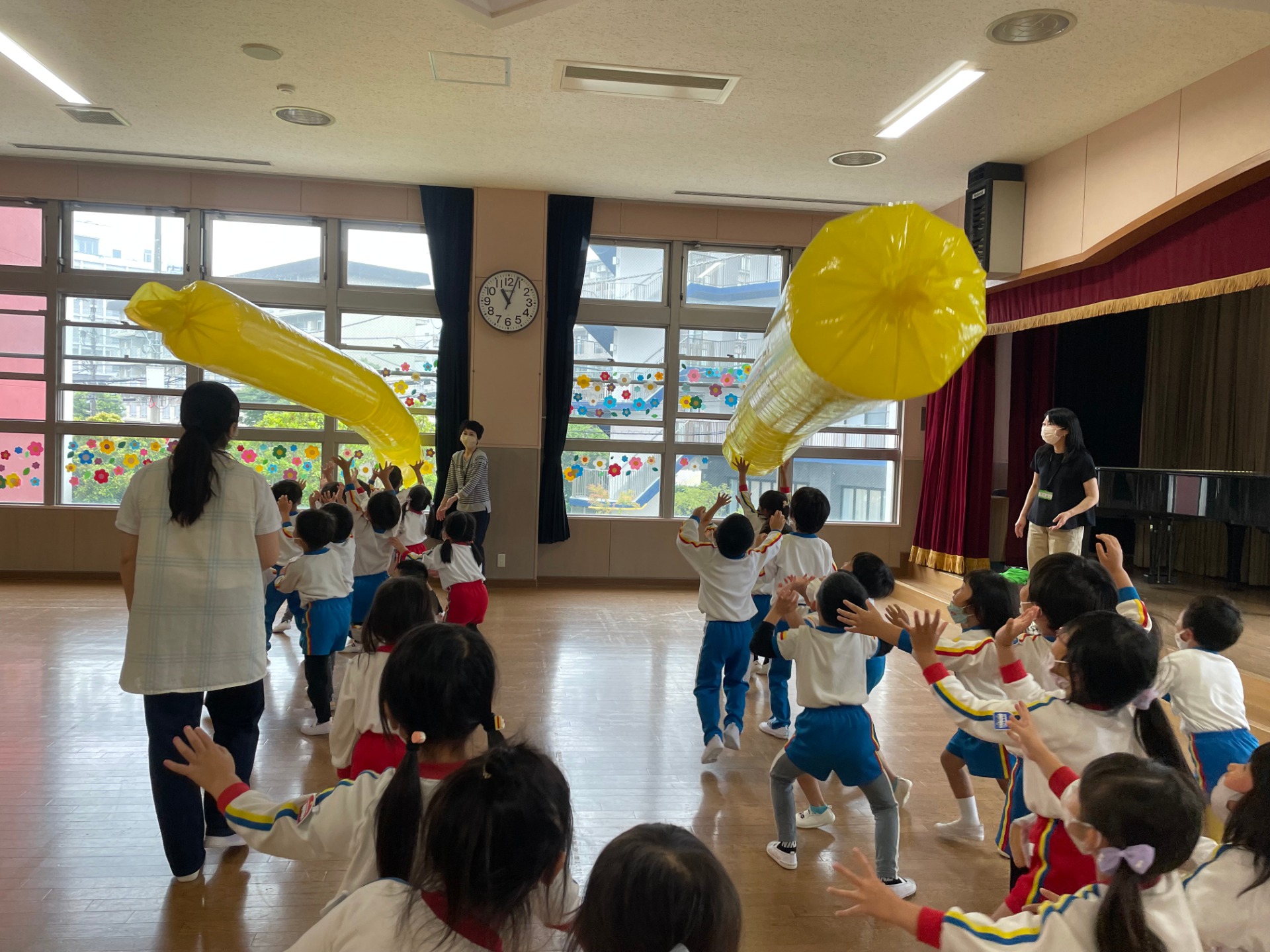 年少、年中児は体を思いきり動かす運動あそびや、鬼ごっこなどのルールのあるあそび、そして縄跳びや鉄棒、マット、跳び箱など器械運動の導入を中心に、また、年長児は鉄棒、マット、跳び箱、縄跳びなどの基礎が身につくように、専門講師による体育指導を行っています。